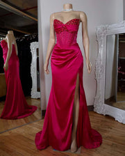 Spaghetti Straps Sweetheart Seeleveless Sheath High Split Pleated Satin Prom Dress with Beads Evening Dress