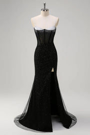 Sparkly Black Mermaid Spaghetti Straps Corset Beaded Long Prom Dress with Slit simple gentle atmospheric and unique desi - US 2 / UK 6 / EU 32