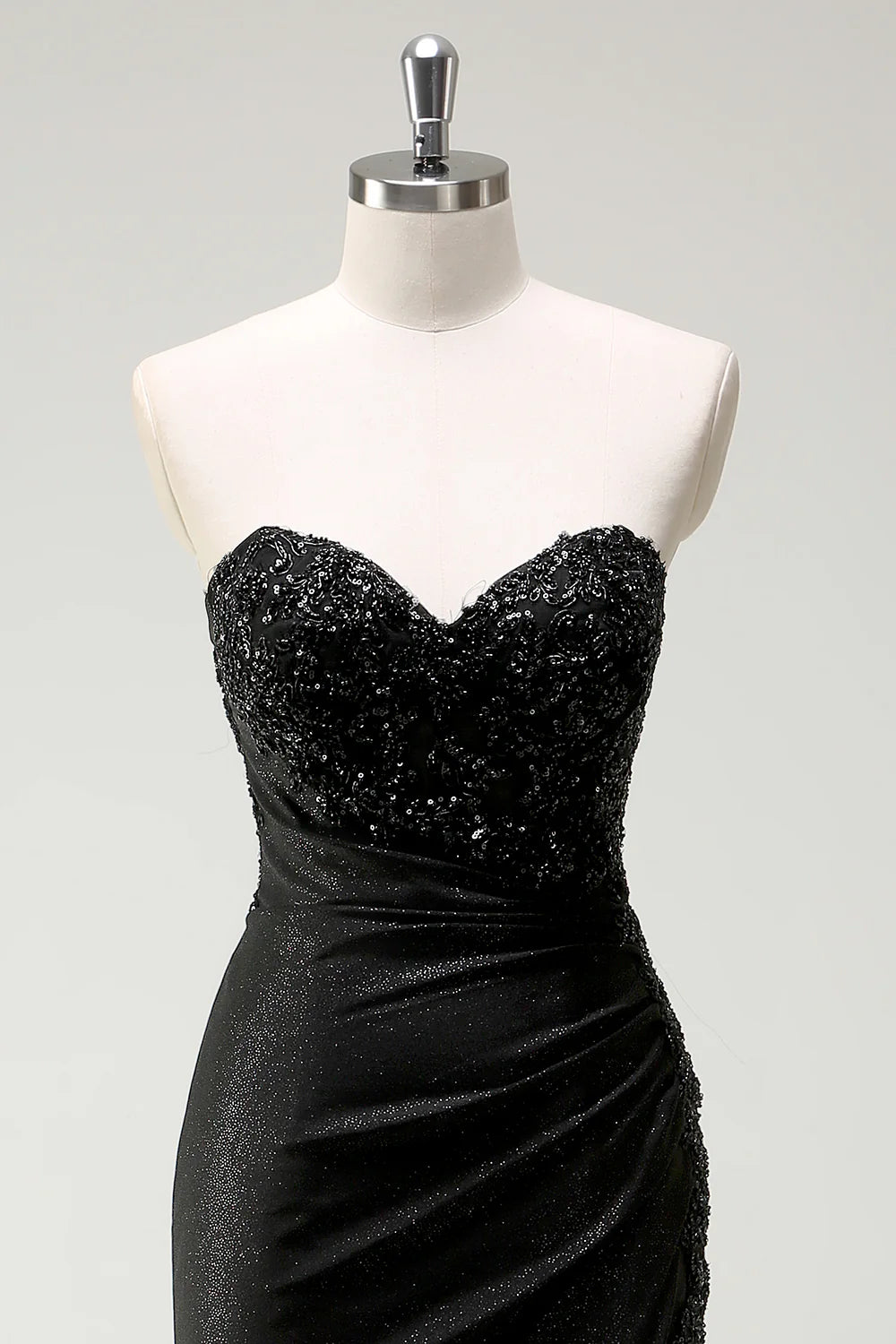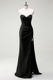 Sparkly Black Mermaid Sweetheart Sequin Ruched Long Prom Dress With High Slit