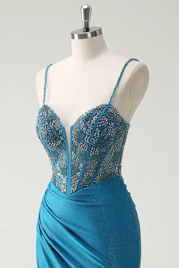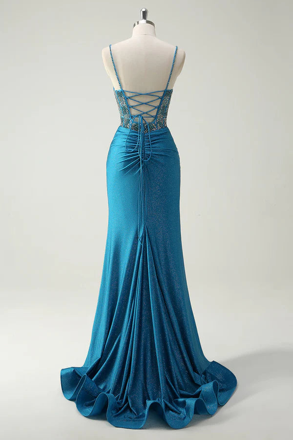Sparkly Blue Spaghetti Straps V-Neck Ruched Long Prom Dress with Beading simple gentle atmospheric and unique desi Bring summer colors to enhance whiteness