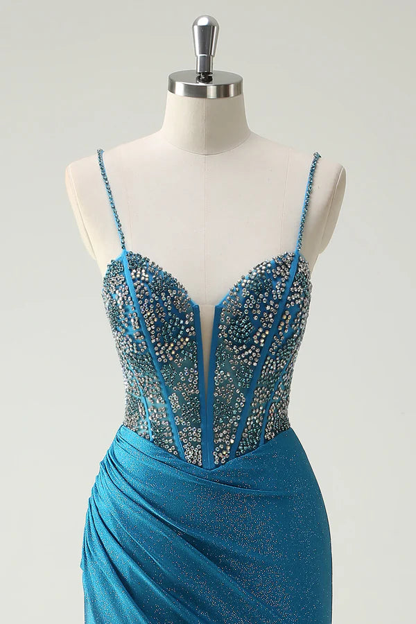 Sparkly Blue Spaghetti Straps V-Neck Ruched Long Prom Dress with Beading simple gentle atmospheric and unique desi Bring summer colors to enhance whiteness - US 2 / UK 6 / EU 32