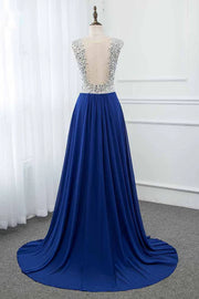 Sparkly Chffon V-Neck Front Slit Royal Blue Prom Dresses with Beading Top Simple gentle atmospheric and unique design