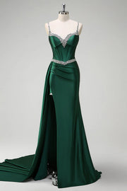 Sparkly Dark Green Mermaid Side Streamer Sequined Corset Satin Prom Dress with Slit simple gentle atmospheric and unique desi