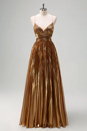 Sparkly Golden A-Line Spaghetti Straps Cut Out Ruched Metallic Long Prom Dress simple gentle atmospheric and unique desi