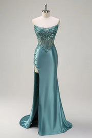 Sparkly Grey Green Mermaid Strapless Corset Appliques Satin Long Prom Dress with Slit simple gentle atmospheric and unique desi