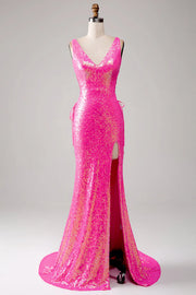 Sparkly Hot Pink Mermaid Prom Dress with Slit