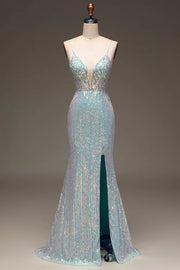 Sparkly Mermaid Grey Blue Prom Dress with Slit Simple gentle atmospheric and unique desig
