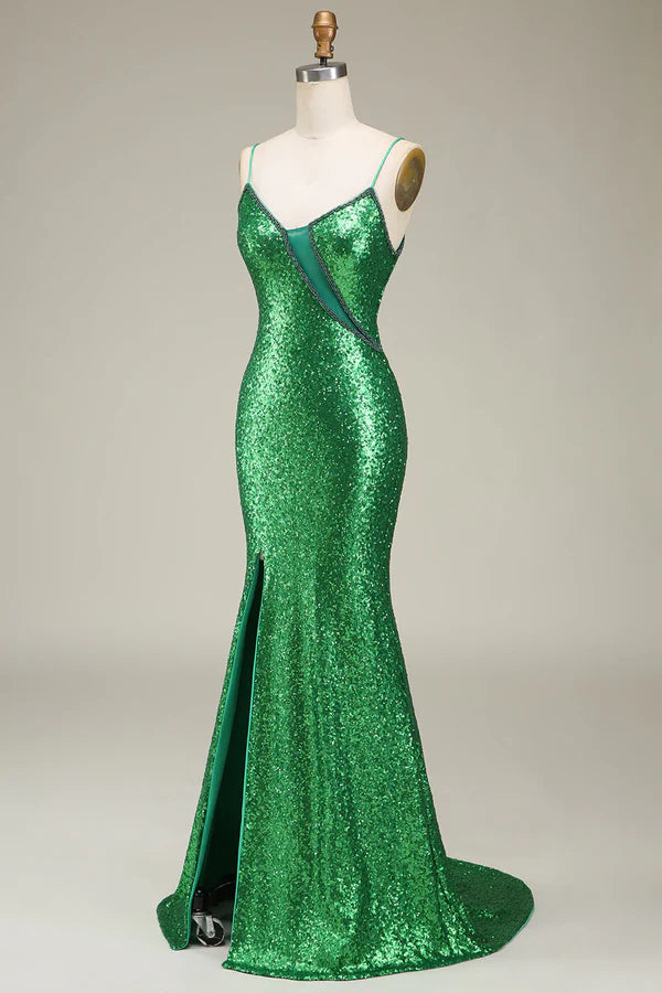 Sparkly Mermaid Spaghetti Straps Green Sequins Long Prom Dress with Split Front Simple gentle atmospheric and unique desig - US 2 / UK 6 / EU 32