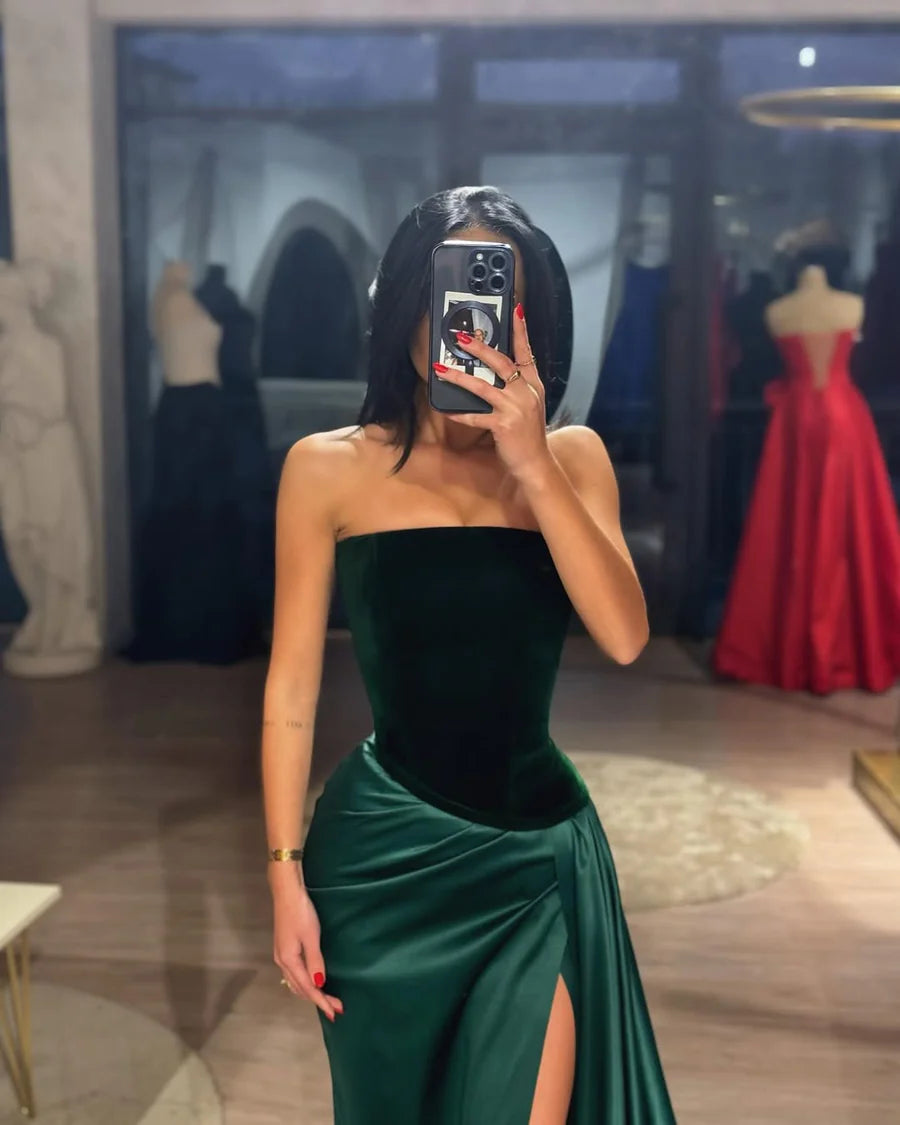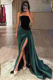 Strapless A-Line Scoop Neck Pleated High Slit Formal Prom Dress