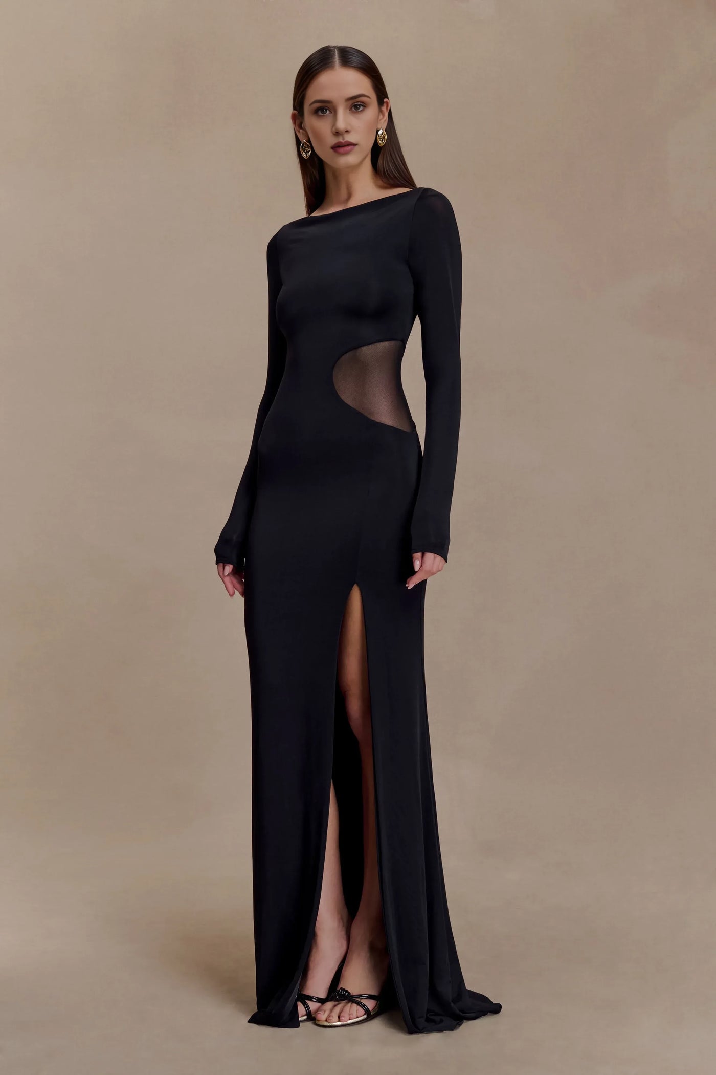 Stylish Sheath Boat Neck Long Sleeve Sheer Cutout Back Floor Length Prom Dress