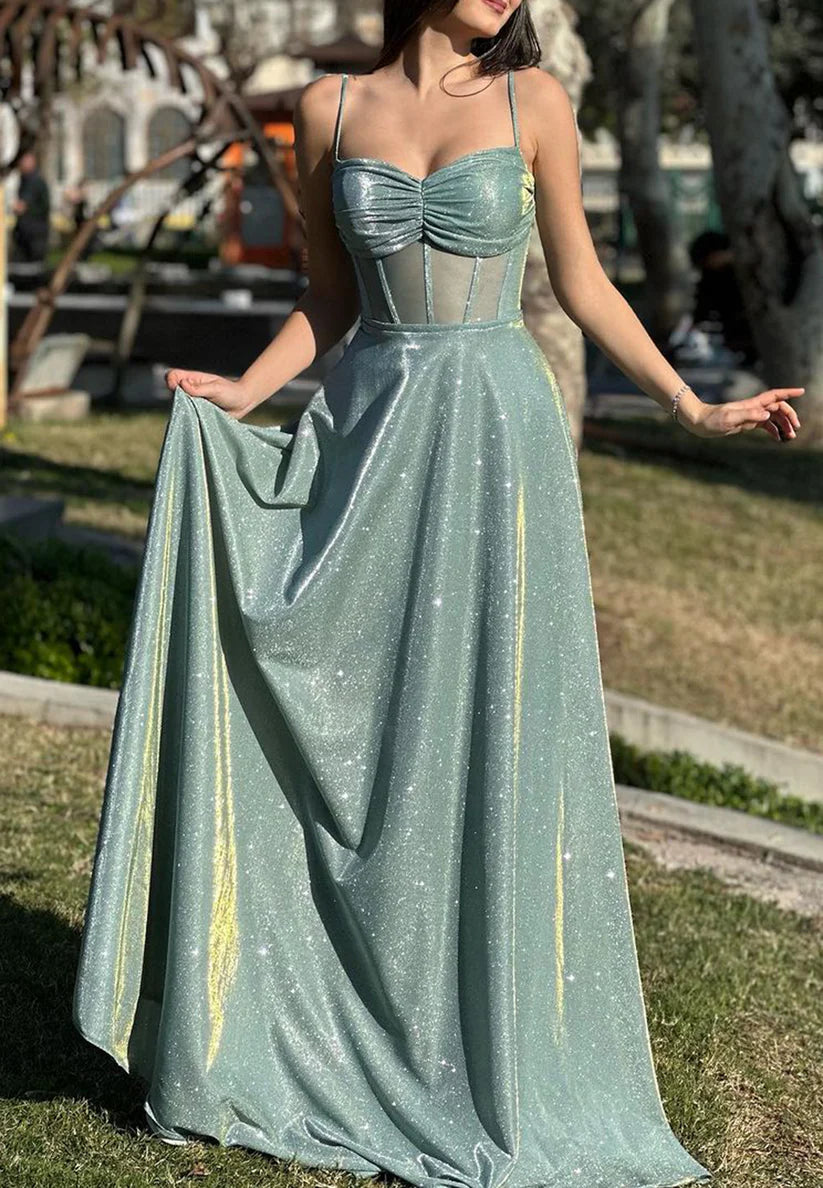 Sweetheart Spaghetti Straps Pleated Sparkly A-Line Prom Dress Simple gentle beautiful and unique design