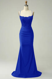 Trendy Mermaid Halter Neck Royal Blue Long Prom Dress with Appliques Beading
