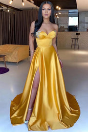 Yellow Sweetheart Prom Dresses Long Slit With Crystal Simple gentle atmospheric and unique design