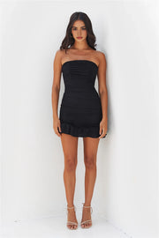 This elegant black strapless dress features a sophisticated pleated design and a delicate ruffled hem, making it an ideal choice for parties, dates, and special occasions. Its structured silhouette enhances your natural shape while offering a stylish and polished look. Perfectly balancing classic charm with modern details, this dress ensures you stand out with understated elegance at any event.