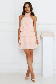 A light pink neck hanging short skirt with three-dimensional flower decorations at the neck. The skirt has multiple layers of ruffled edges and is suitable for parties, dates, etc - US 2 / UK 6 / EU 32