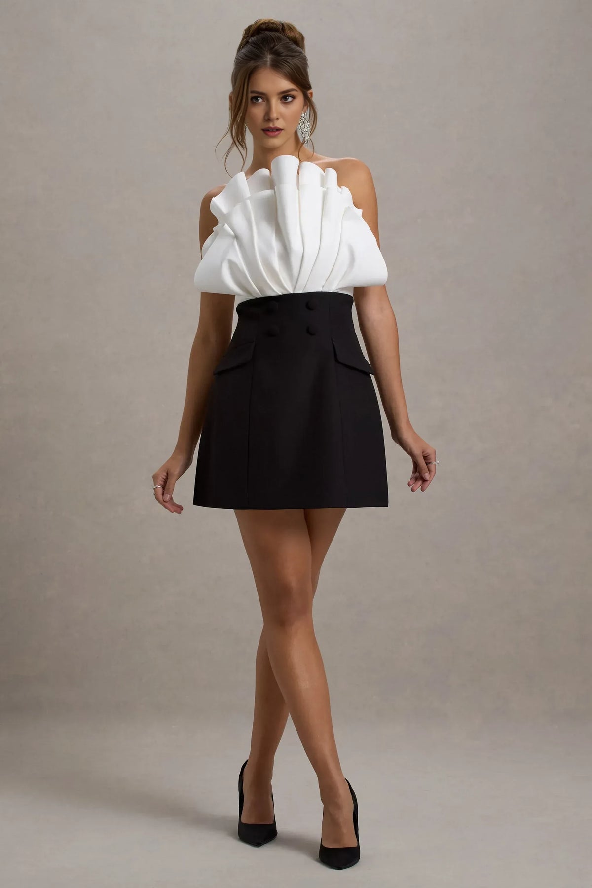 This prom dress features an A - line silhouette that offers a playful and eye - catching fit. The strapless neckline brings a classic and daring touch, while the sleeveless style provides a balanced and refined look. The sculptural ruffle accent adds elements of daring allure, enhancing the dress's overall appeal. With a mini length design, it's ideal for prom, ensuring the wearer looks daring and poised.