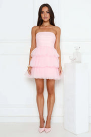 Light pink strapless chiffon skirt with pleated upper half and multi-layer mesh skirt suitable for parties