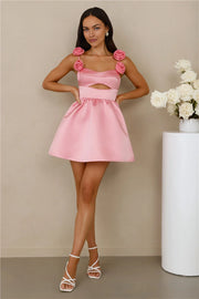 Elevate your style with this pink satin dress featuring delicate three-dimensional floral embellishments on the shoulder straps. Its strategically placed hollow designs on the chest and waist add a modern, flattering touch, making it ideal for parties, dates, and special occasions. Crafted to combine elegance with subtle allure, this dress ensures you stand out with refined sophistication and graceful charm.