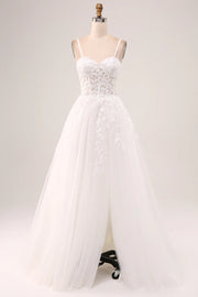 Ivory A-Line Spaghetti Straps Lace Appliques Tulle Wedding Dress with Slit