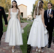 Satin Tulle Midi Wedding Dress Simple Square Neckline Tea Length Formal Prom Dress