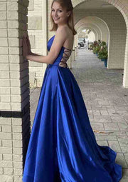 A-Line V-Neck Spaghetti Straps Prom Dress/Evening Dress With Pockets - Charmeuse Sweep Train