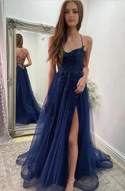 Navy Blue Halter Front Slit Spaghetti Straps A-Line Tulle Prom Gown Simple gentle atmospheric and unique design