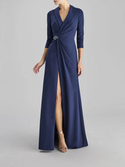 Navy Blue Ruched Maxi Dress with Side Slit and Brooch A-line crepe party dress with three-quarter sleeves Mother of the Bride Dresses