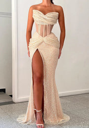 Scoop Sleeveless Sheer High Slit Sheath Prom Dress simple gentle atmospheric and unique desi Bring summer colors to enhance whiteness
