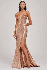 Sparkly Champagne Mermaid Strapless Sequins Long Prom Dress with Slit simple gentle atmospheric and unique desi Bring summer colors to enhance whiteness