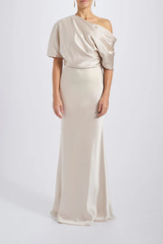 The Slouch Dress - Fluid Satin off-one-shoulder draped bodice gown with bias column skirt. Simple atmospheric beautiful and unique design